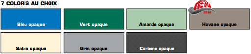Bleu opaque, vert opaque, amande opaque, havane opaque, sable opaque, gris opaque, carbonne opaque.