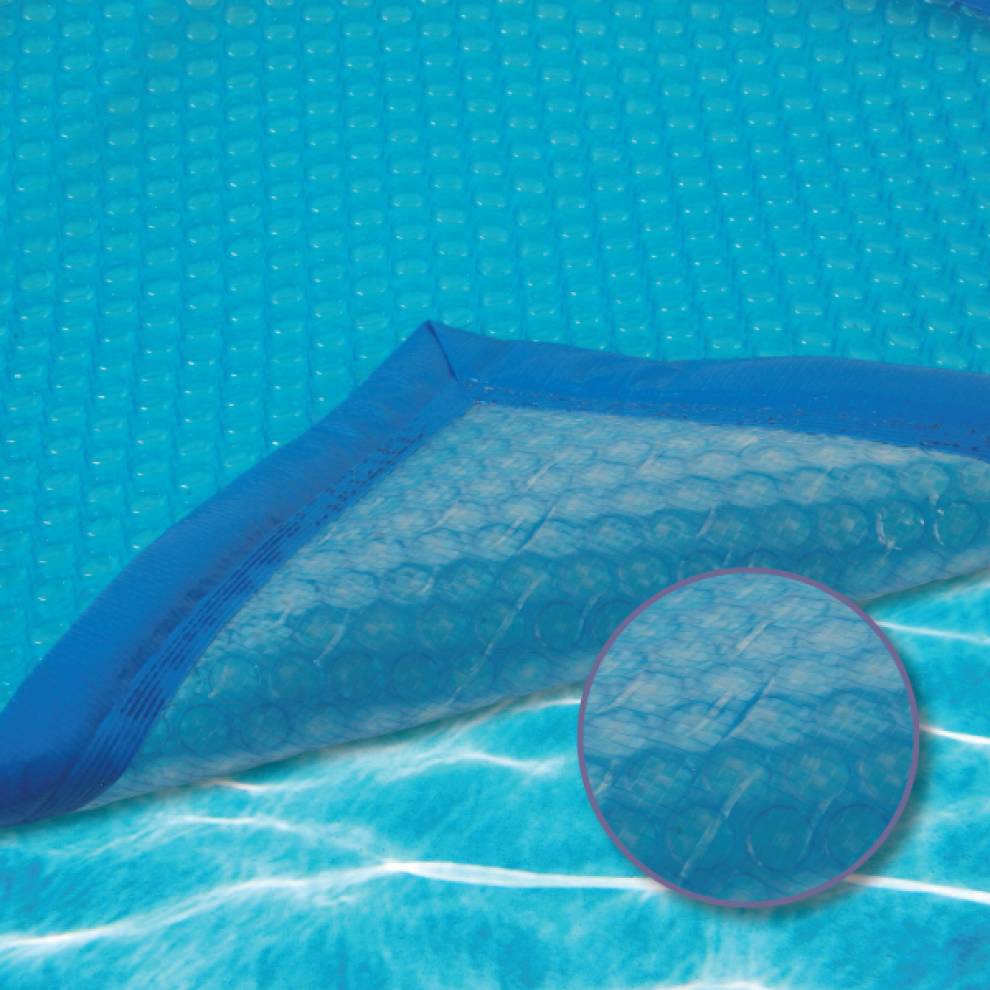 Couverture à bulles plus résistante que les couvertures standard du marché. Une feuille tramé PEHD renforce la solidité de la couverture à bulles dans le temps