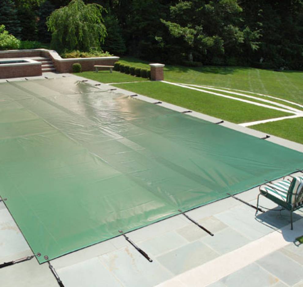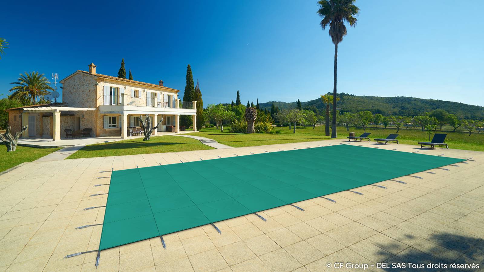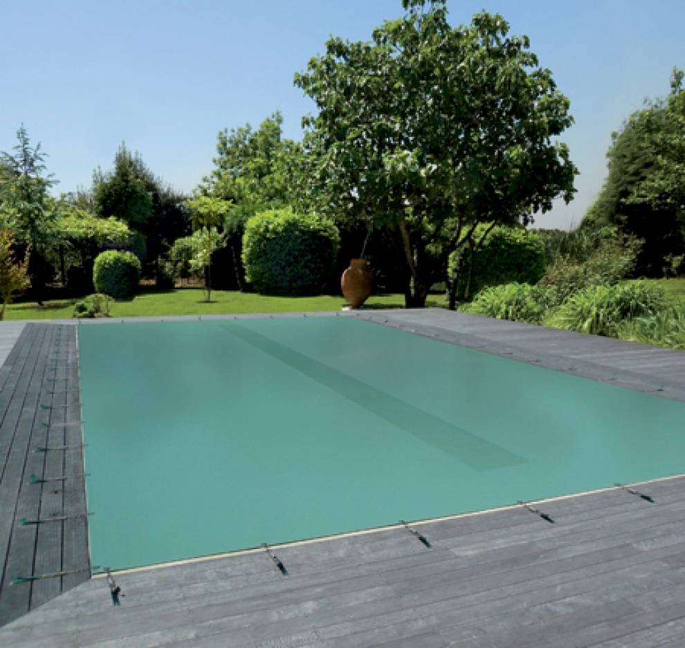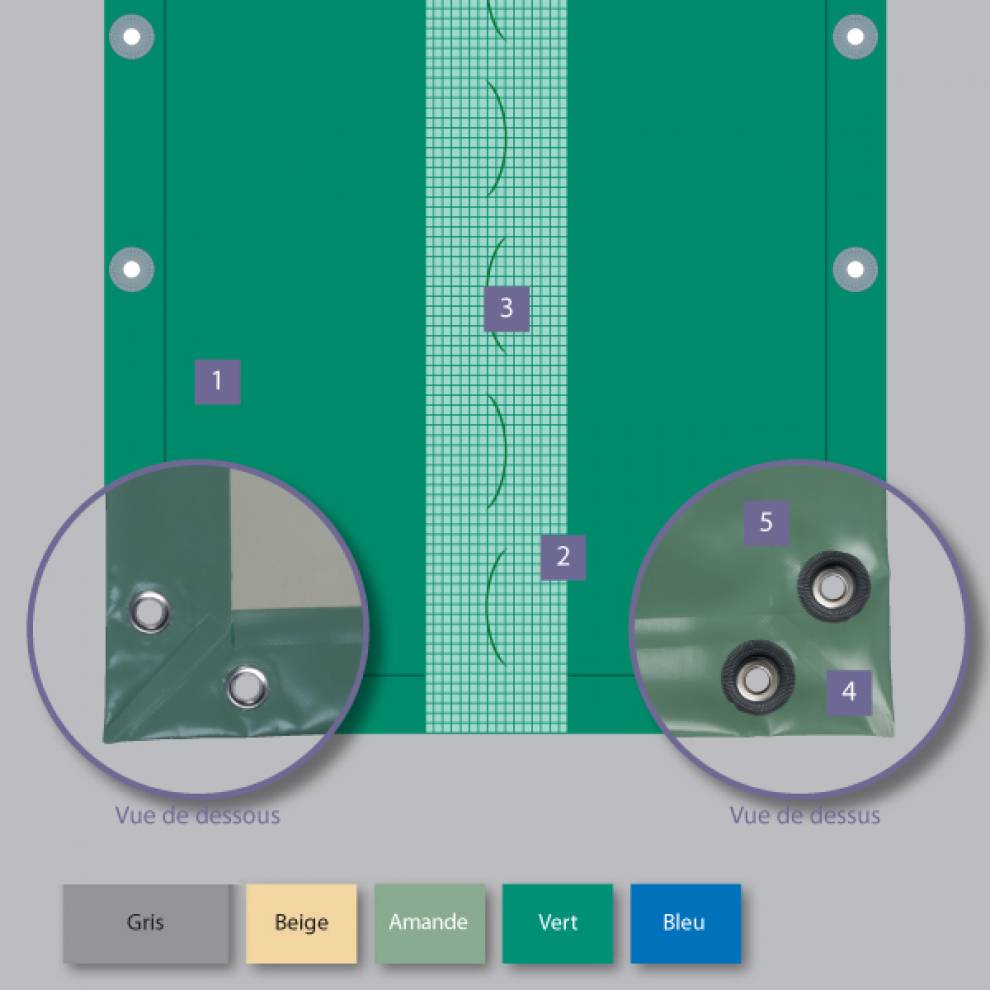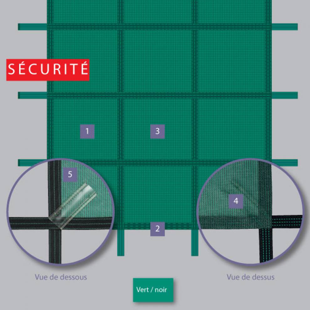 garantie 3 ans, coloris disponible vert, conforme à la norme de sécurité NFP 90-308, dimensions maximales 6m x 13m, poids 235g/m², meilleure résistance à la déchirure, doté d'une robustesse à toute épreuve, meilleure résistance à l'abrasion des margelles, limitation de la photosynthèse (89% d'opacité), différents systêmes d'accrochage (piton simple, piton escamotable et pour plage bois), meilleure solidité et sécurité optimale.