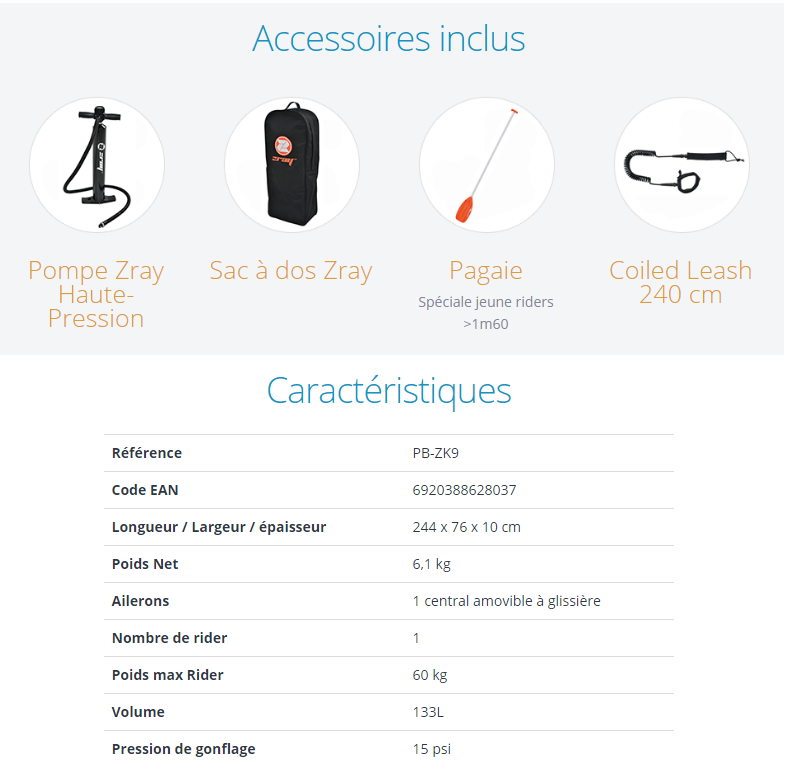 Le paddle K9 est conçu avec la technologie Drop-stitch (technologie de gonflage marine reconnue) composée de milliers de fibre polyester pour une solidité inégalée à ce jour. La planche de paddle est de dimensions de 244 x 76 x 10 cm de hauteur, elle comprend de nombreux accessoires inclus à l'achat (pagaie > 1,60m, sac à dos de transport, pompe de gonflage haute pression et collier coiled leash 240cm).