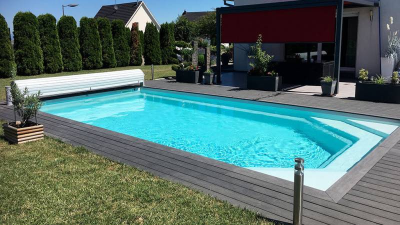 Le fond plat et la grande banquette offrent confort et bien-être, et transforment la piscine en véritable lieu de convivialité. Les marches spacieuses permettront quant à elles une mise à l’eau en toute sérénité et en toute sécurité pour les plus jeunes baigneurs.