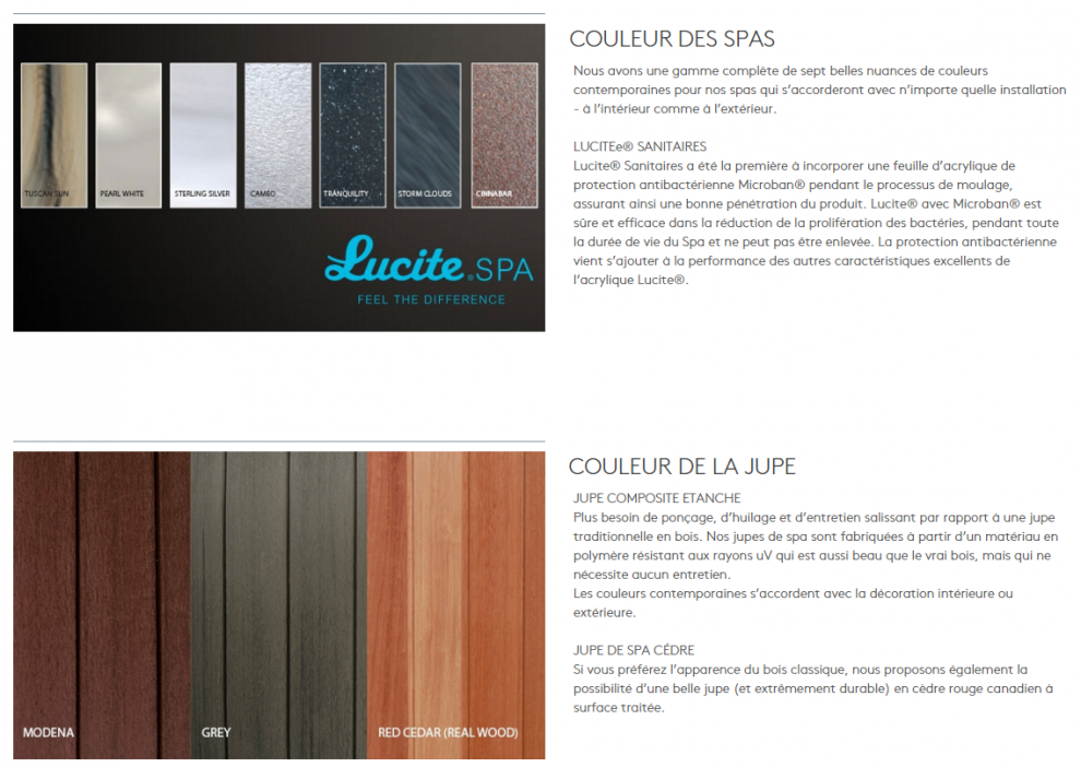 Nous avons une gamme complète de sept belles nuances de couleurs contemporaines pour nos spas qui s’accorderont avec n’importe quelle installation à l’intérieur comme à l’extérieur. Lucite® Sanitaires a été la première à incorporer une feuille d’acrylique de protection antibactérienne Microban® pendant le processus de moulage, assurant ainsi une bonne pénétration du produit.