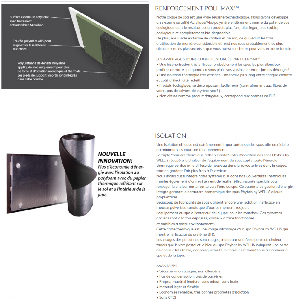 Une Isolation efficace est extrêmement importante pour les spas afin de réduire au minimum les coûts de fonctionnement. La triple “barrière thermique réfléchissante” (btr) d’isolation des spas Phybris by WELLIS récupère la chaleur de l’équipement du spa, capte toute l’énergie thermique perdue et la diffuse de nouveau dans la tuyauterie et dans la coque, tout en gardant l’air plus frais à l’extérieur.Nous avons aussi intégré notre système BTR dans nos Couvertures Thermiques munies également d’un revêtement de feuille réfléchissante spéciale pour renvoyer la chaleur remontante vers l’eau du spa. Ce système de gestion d’énergie intégré garantit le caractère économique des spas Phybris by WELLIS. Beaucoup de fabricants de spas utilisent encore une isolation inefficace en mousse pulvérisée tandis que d’autres montent toujours l’équipement du spa à l’extérieur de la jupe, sous les marches. Ces systèmes anciens sont à la fois dépassés, coûteux à faire fonctionner et nuisibles à notre environnement.