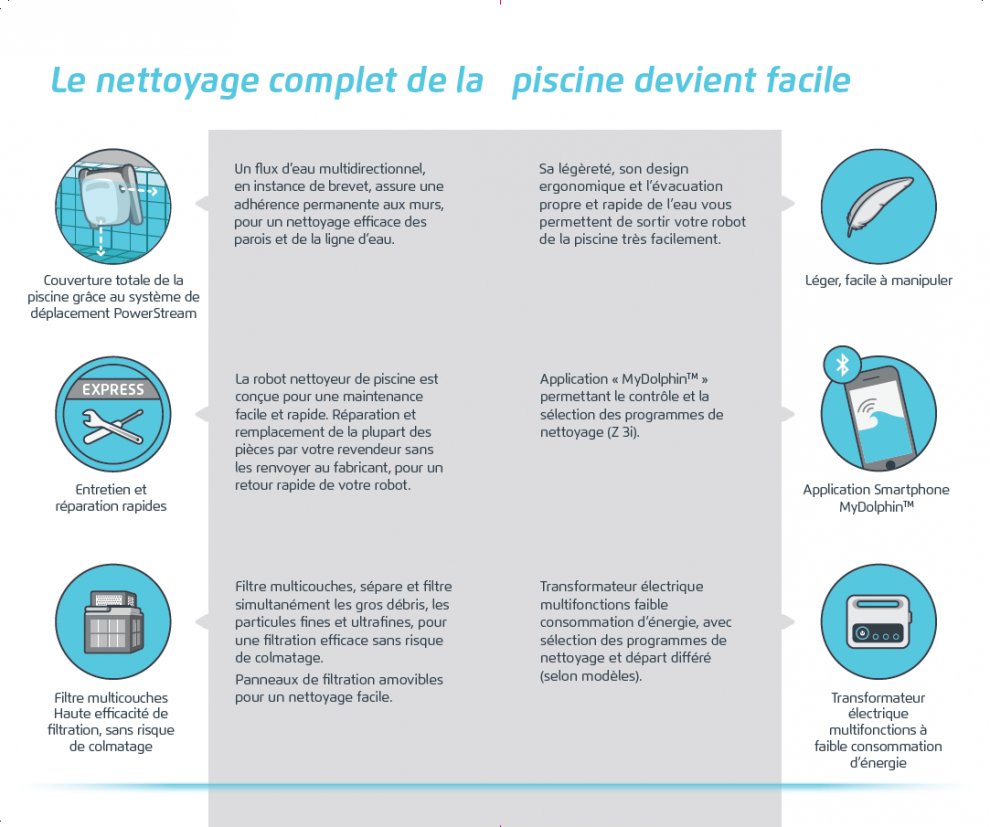 Le Dolphin Zenit Z3i doit son efficacité de filtration au fait que la cartouche filtrante est équipée d'un deuxième panier filtrant à insertion extra-fine. Ainsi, il existe une cartouche filtrante pour les saletés grossières, les saletés fines et les saletés ultrafines. Après chaque nettoyage, vous pouvez facilement nettoyer les filtres grâce aux éléments filtrants facilement amovibles.
