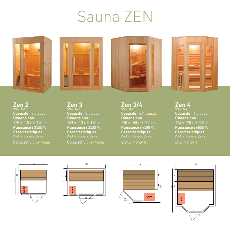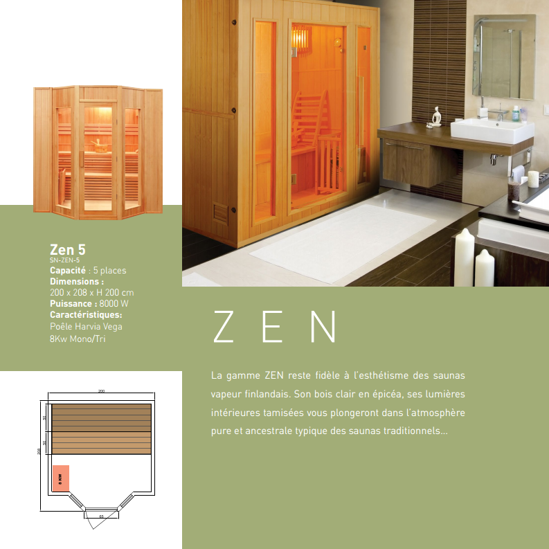 La gamme ZEN reste fidèle à l’esthétisme des saunas vapeur finlandais. Son bois clair en épicéa, ses lumières intérieures tamisées vous plongeront dans l’atmosphère pure et ancestrale typique des saunas traditionnels…
