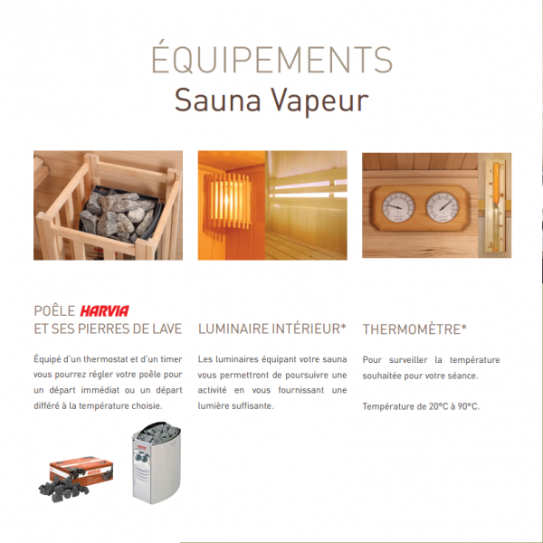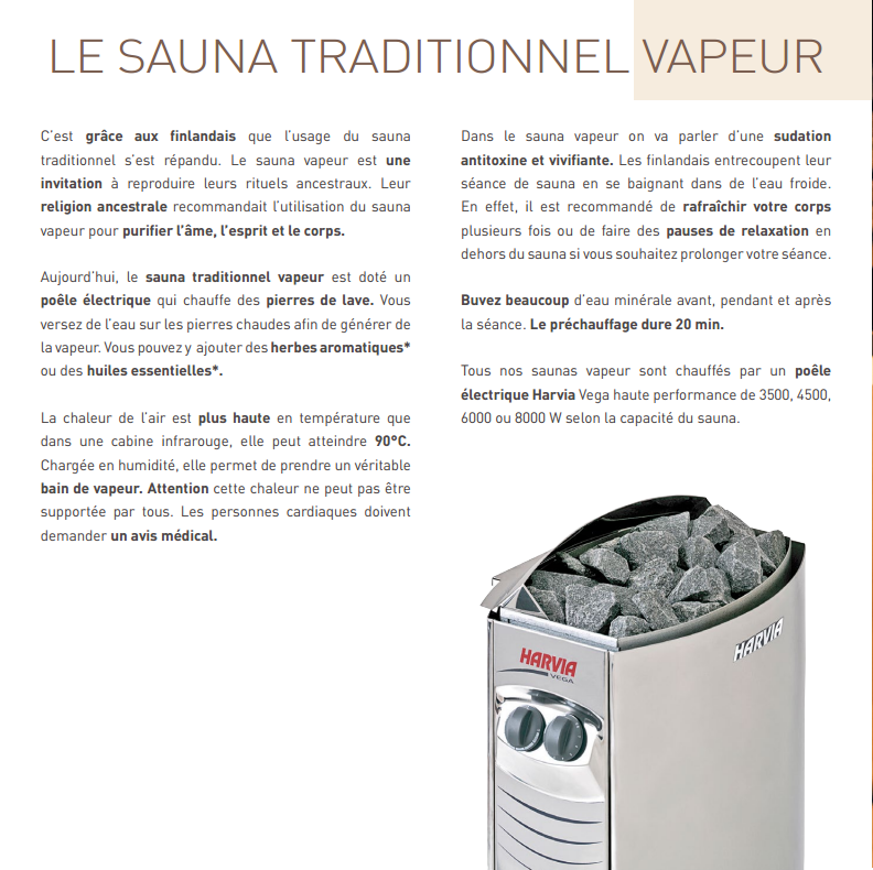 Attention cette chaleur ne peut pas être supportée par tous. Les personnes cardiaques doivent demander un avis médical. Dans le sauna vapeur on va parler d’une sudation antitoxine et vivifiante. Les finlandais entrecoupent leur séance de sauna en se baignant dans de l’eau froide. En effet, il est recommandé de rafraîchir votre corps plusieurs fois ou de faire des pauses de relaxation en dehors du sauna si vous souhaitez prolonger votre séance. Buvez beaucoup d’eau minérale avant, pendant et après la séance. Le préchauffage dure 20 min. Tous nos saunas vapeur sont chauffés par un poêle électrique Harvia Vega haute performance de 3500, 4500, 6000 ou 8000 W selon la capacité du sauna.