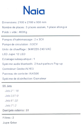 - Eclairage : 1 éclairage subaquatique, 12 leds et 31 jets éclairés