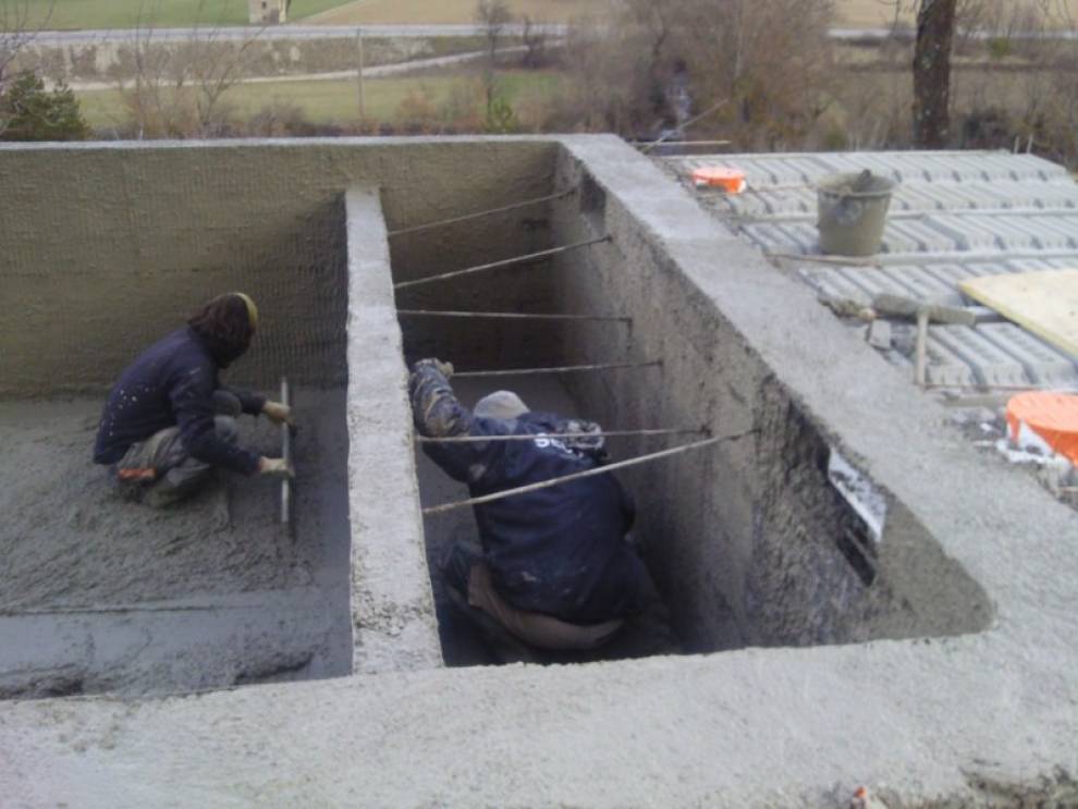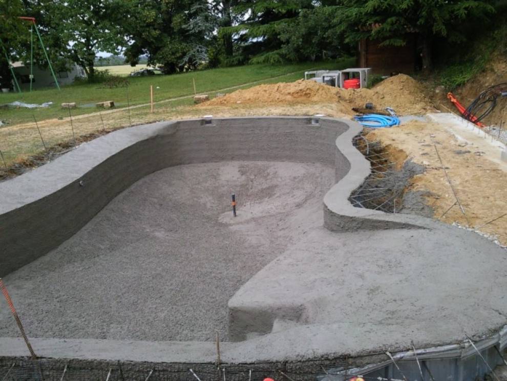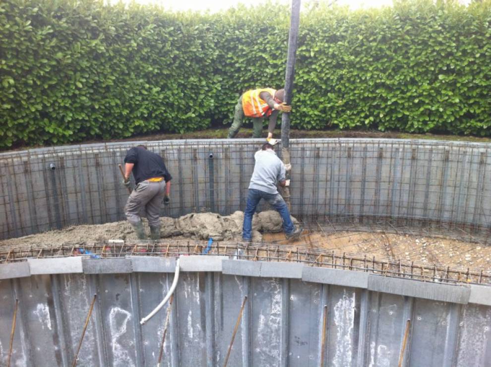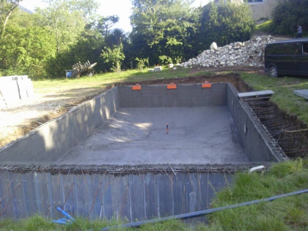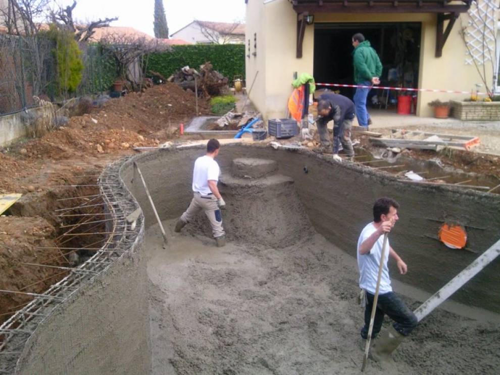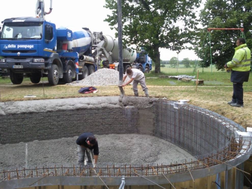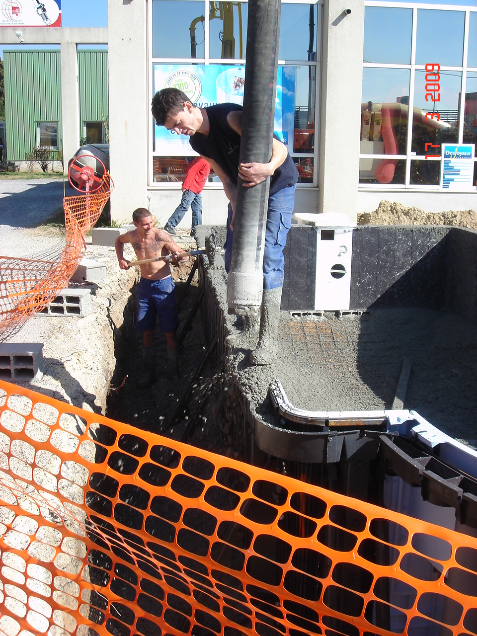 Coulage de la piscine se fait par des toupies à béton et n'est pas projeté contre les parois afin d'être plus précis et assurer une bonne mise en place du béton et son hydrofuge