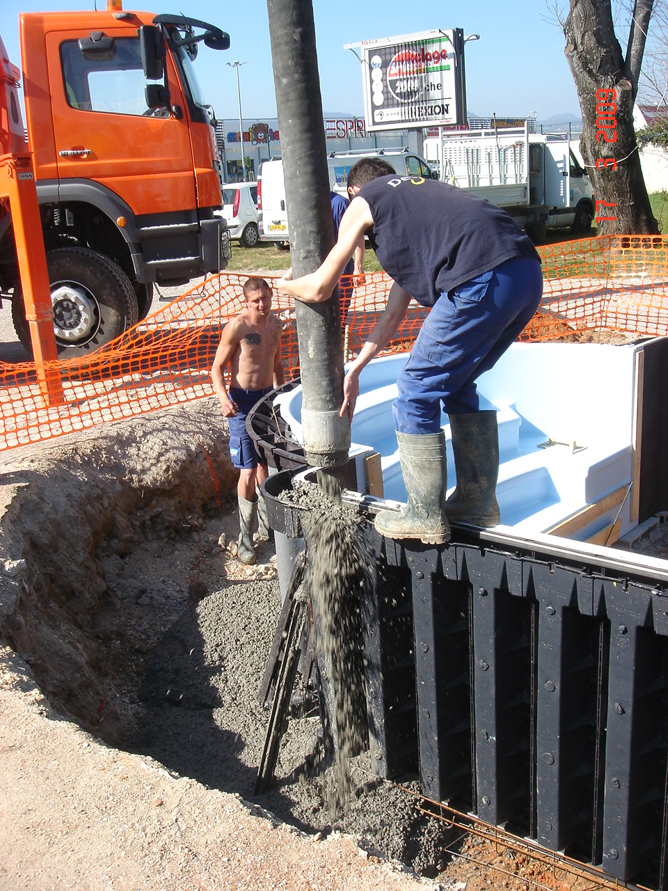 A ce stade, le béton est mis en place à l'aide de toupies à béton amenant la quantité nécessaire de béton pour l'ensemble de la piscine. Cette opération est réalisée en une seule fois. Une véritable piscine qui va devenir un monobloc de béton armé, un des aspects crucial pour assurer une bonne solidité de la structure. Une couche d'une épaisseur d'environ 20cm de béton est alors répartie dans toute la piscine selon les process de fabrication. Le béton mis en place est sépcifique pour chaque concept de piscine.