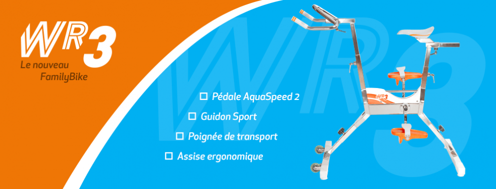 Le nouvel aquabike WR3 (évolution du Family Bike) associe la séduction de son design, à des innovations techniques pour vous simplifier son utilisation, une ergonomie repensée, le tout avec une légèreté très appréciée.